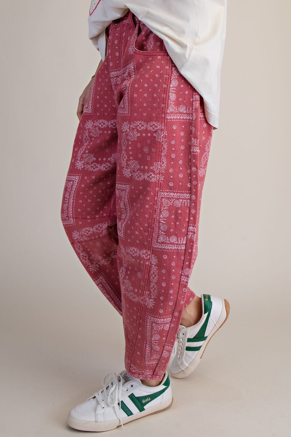 Dusty rose red bandana print barrel jeans with elastic in back of waist.
