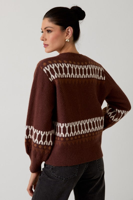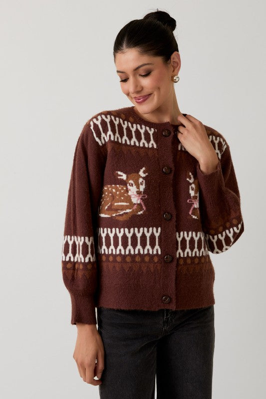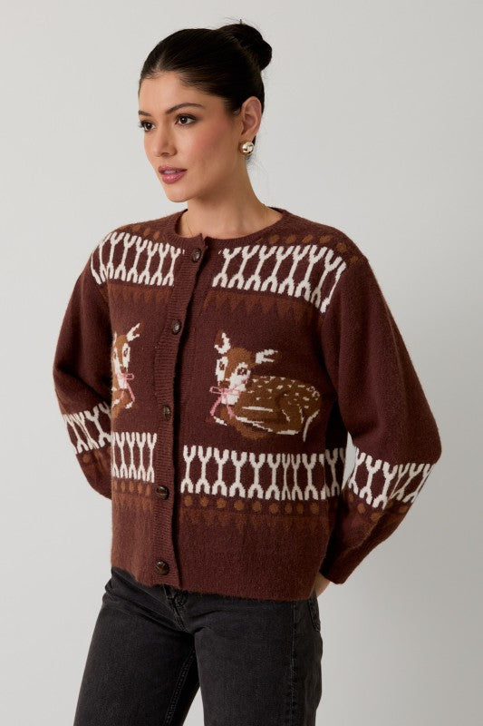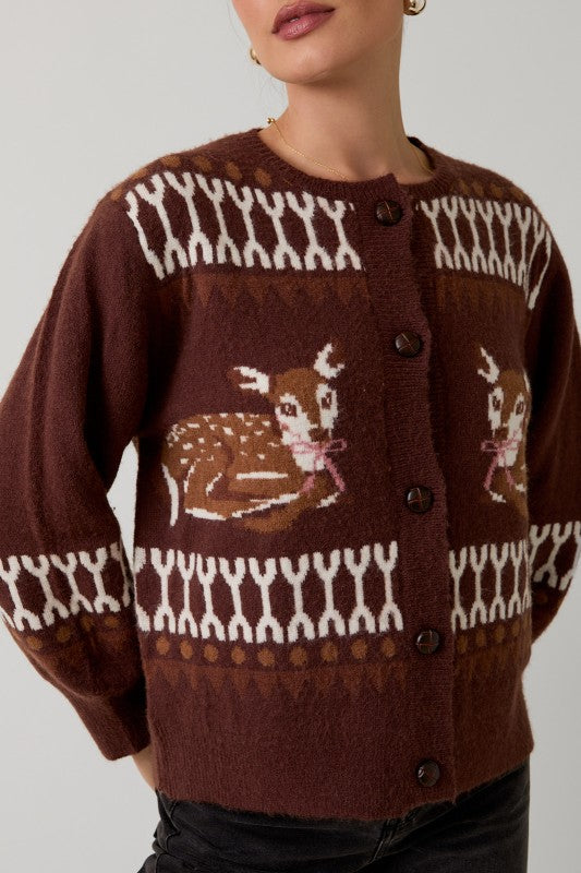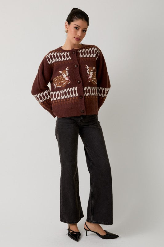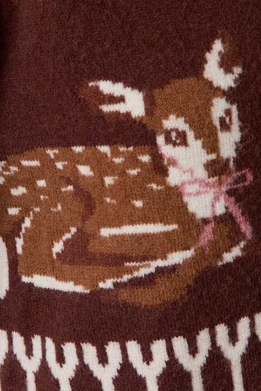 Cozy up in this chunky brown sweater with the cutest deer graphic!