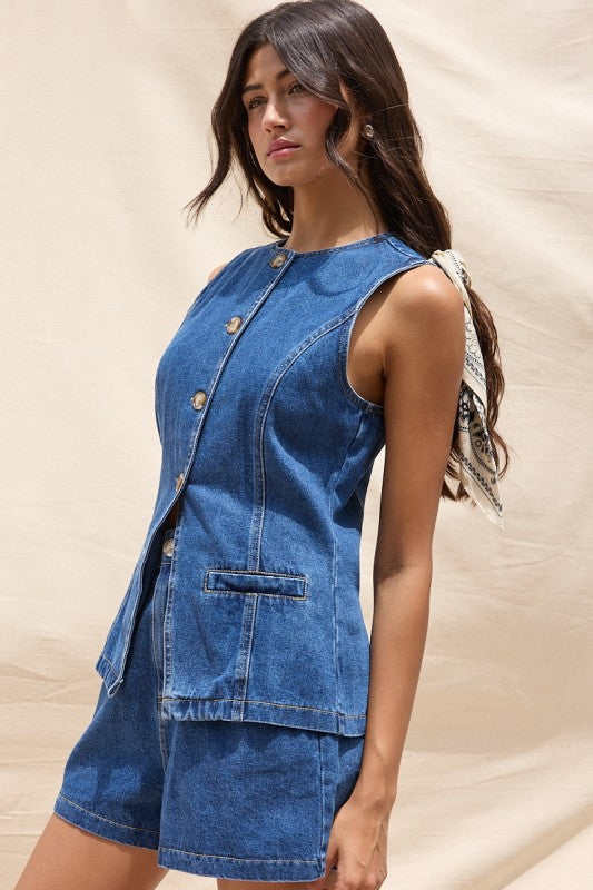 Medium-wash light-weight denim set complete with long line button-up vest top & high-waisted dark denim shorts with elastic in back for the perfect fit.