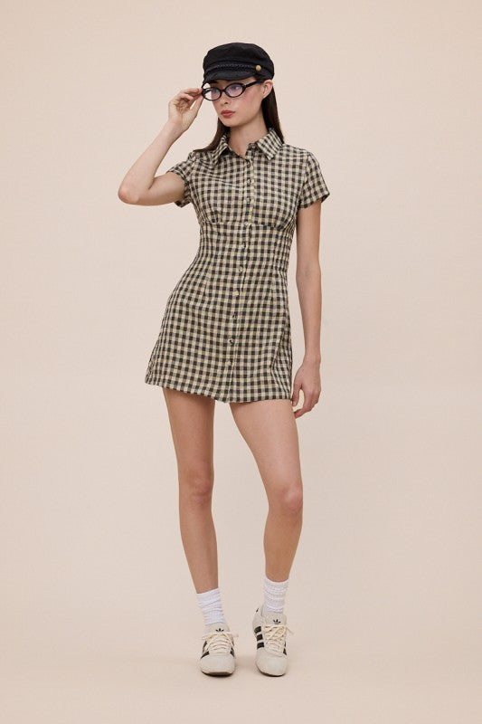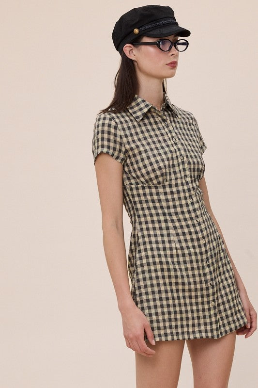 Vintage inspired taupe & black gingham dress with cinched waist, front button closure & collar.