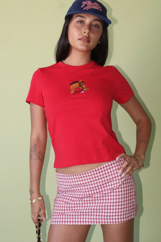 100% cotton red & off-white gingham mid to low-rise mini skort with hidden side zipper.