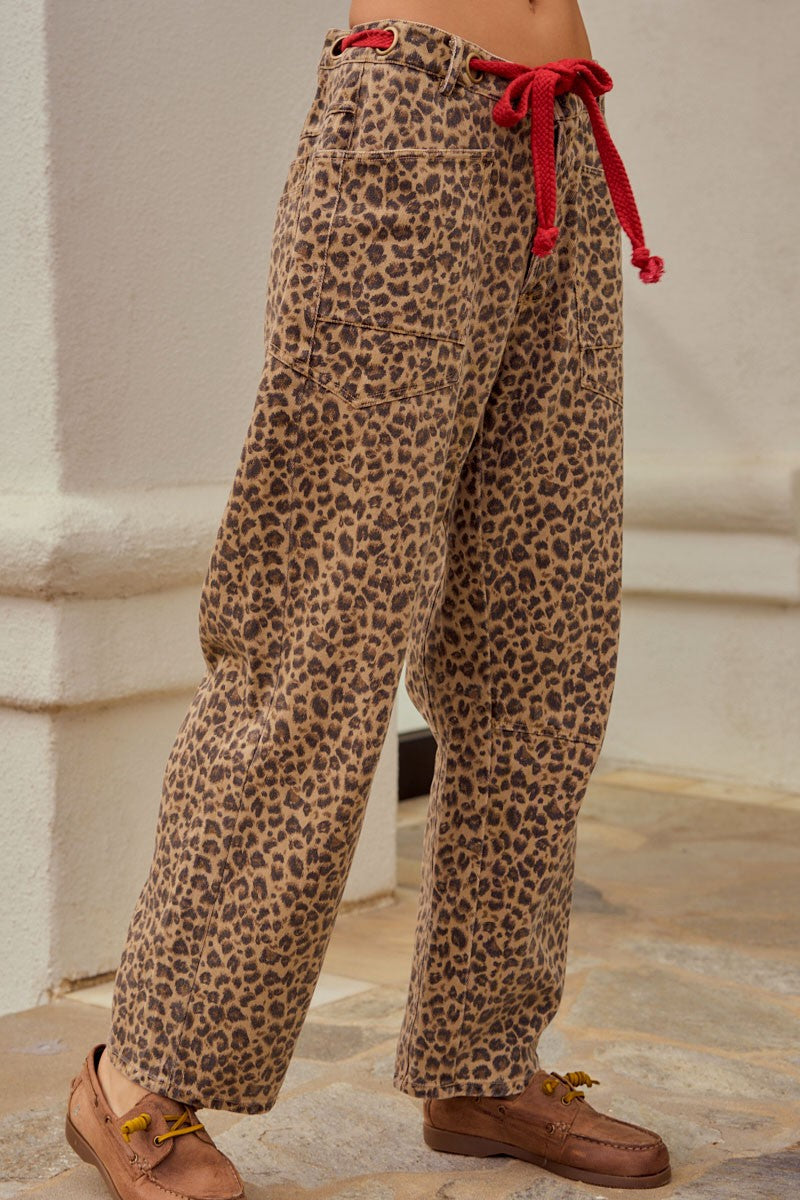 Vintage wash leopard jeans with relaxed barrel fit & red rope belt.