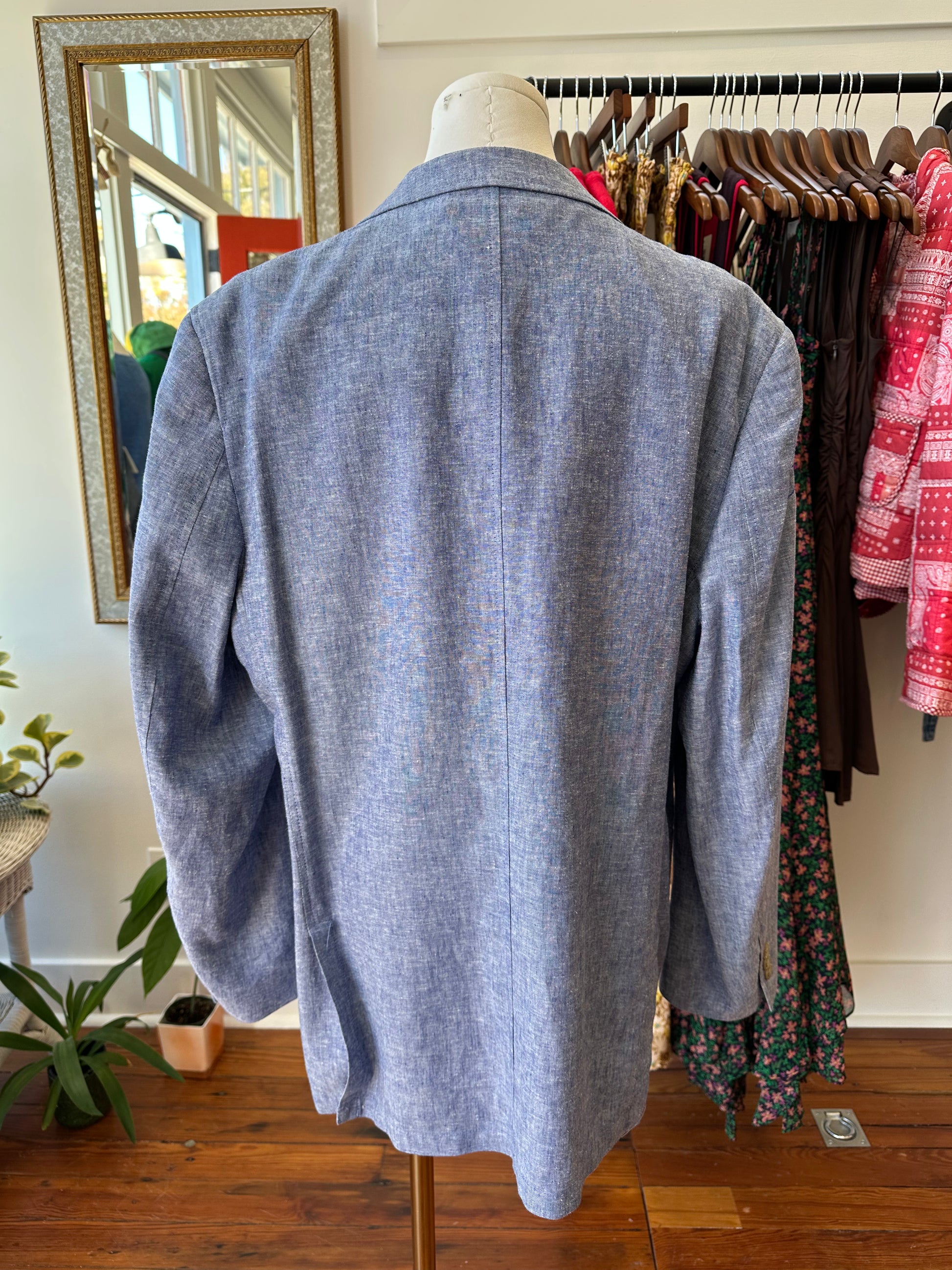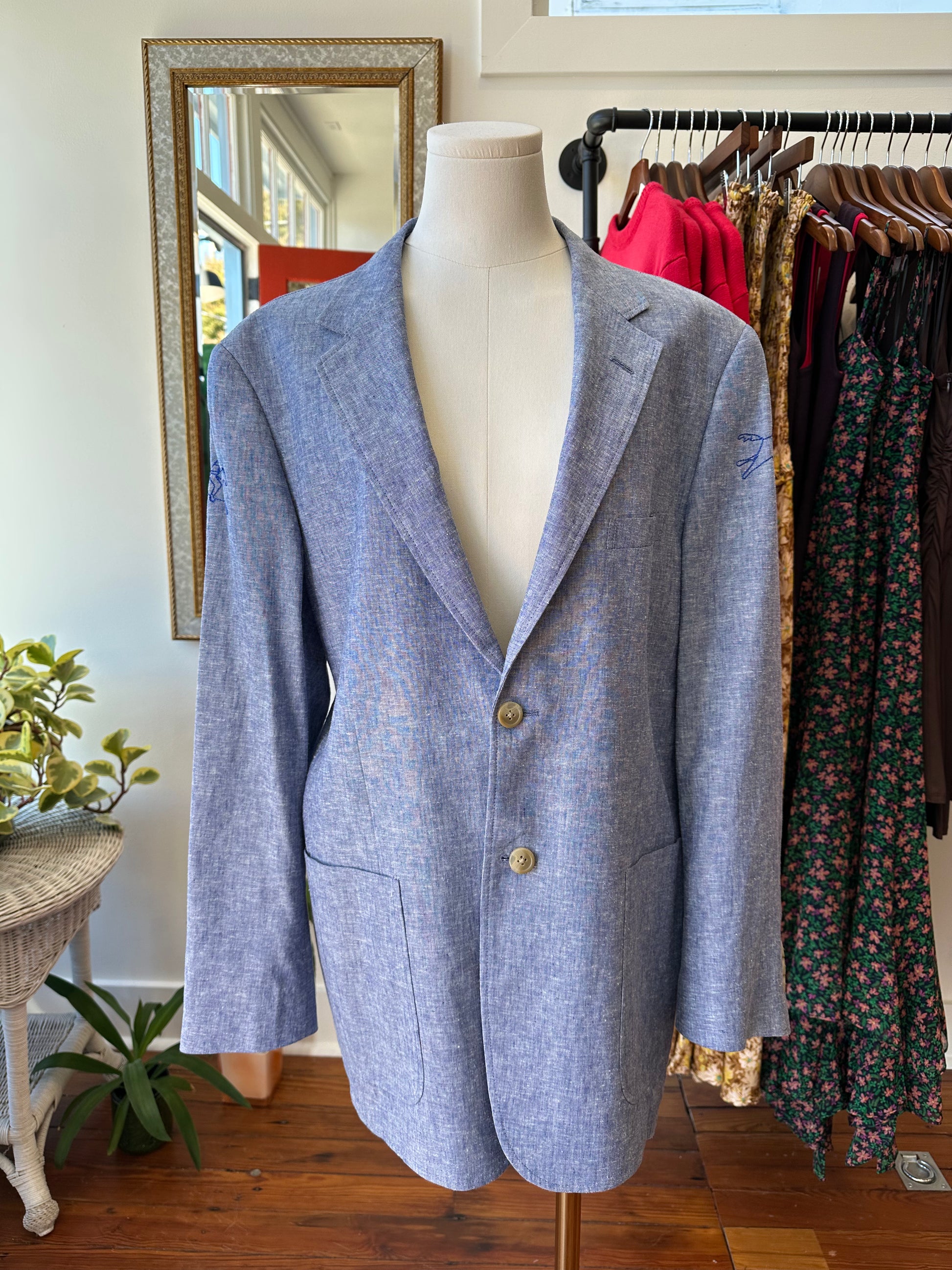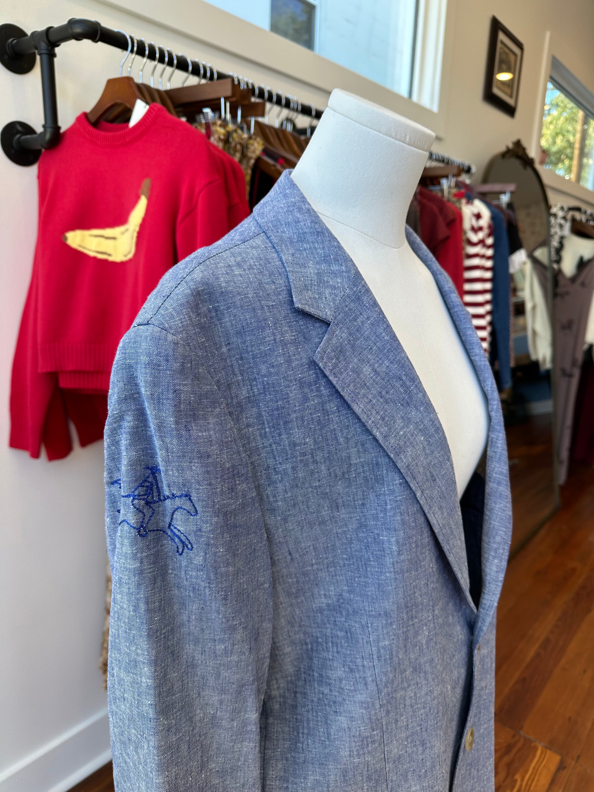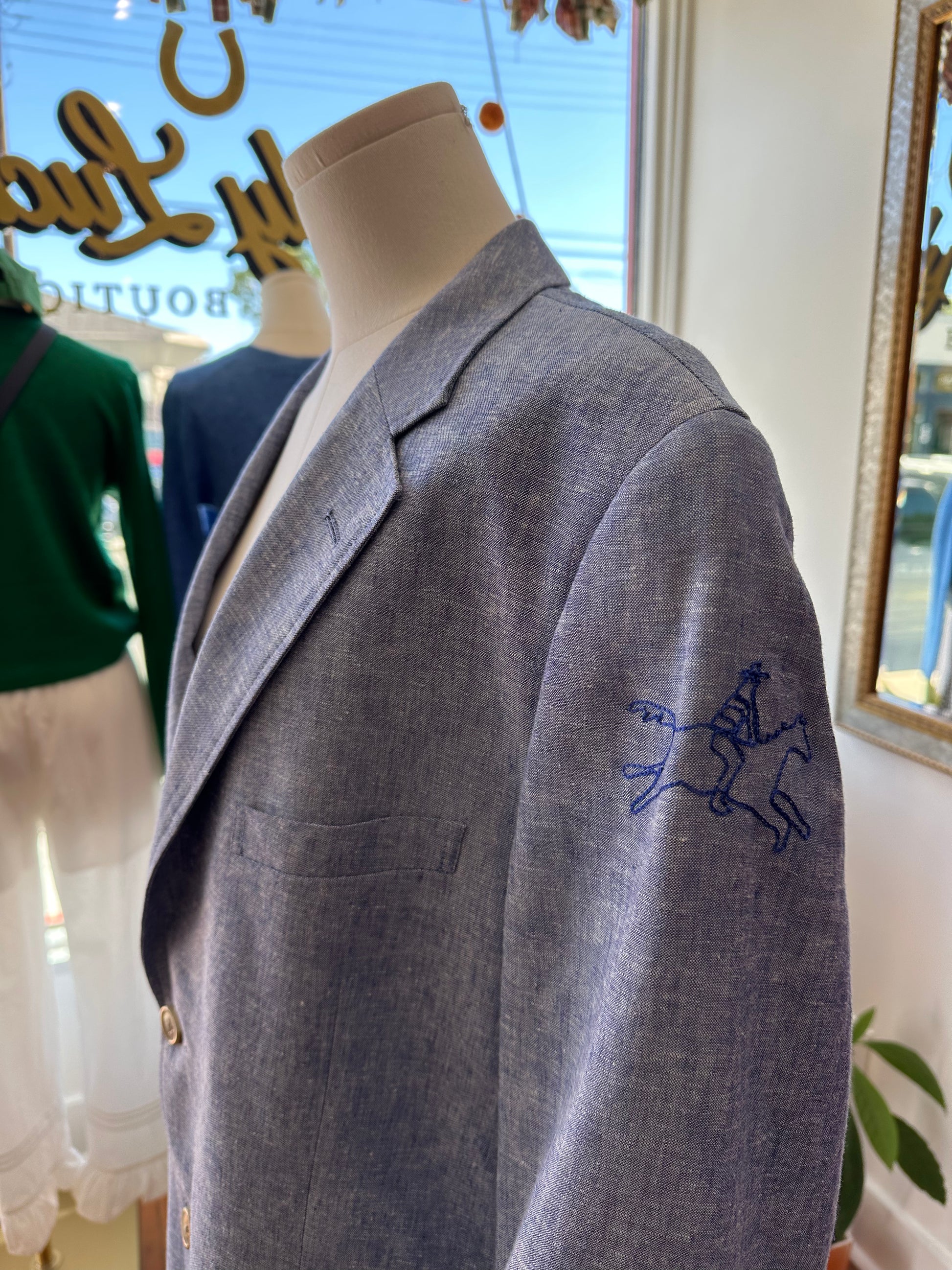 Dusty baby blue vintage blazer with a royal blue cowboy chain-stitched on each arm.