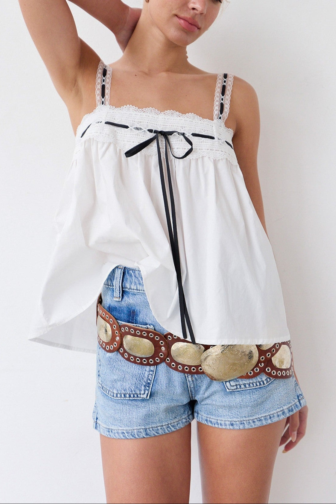 Super lightweight & flowy white blouse with black ribbon & white lace detailing.